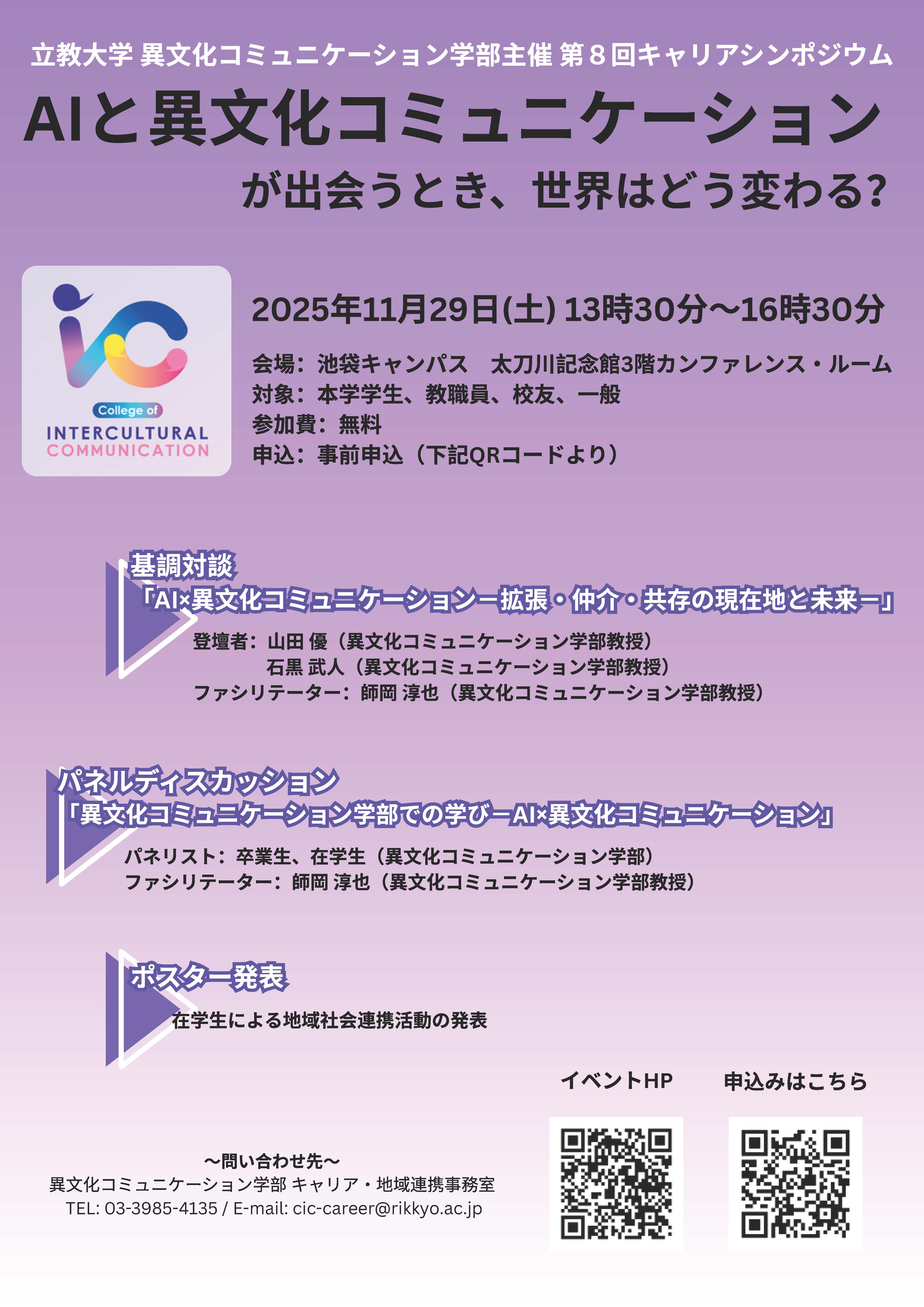 国内外様々な形で社会に貢献する卒業生や在学する正規留学生、また、地域貢献活動に携わる在学生の姿を通し、異文化コミュニケーション学部の行うグローバル人材育成について産業界に広く伝えることを目的として開催しています。